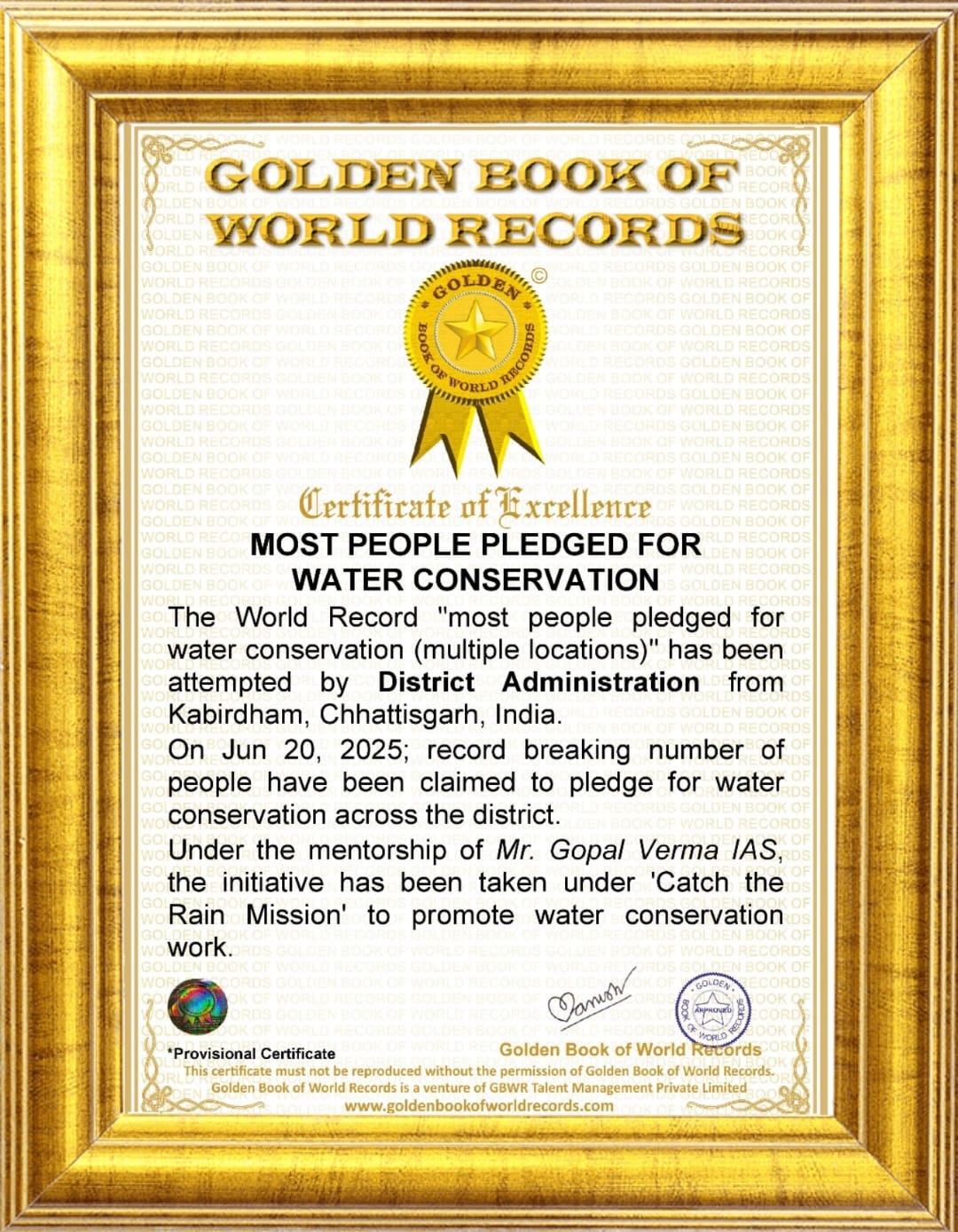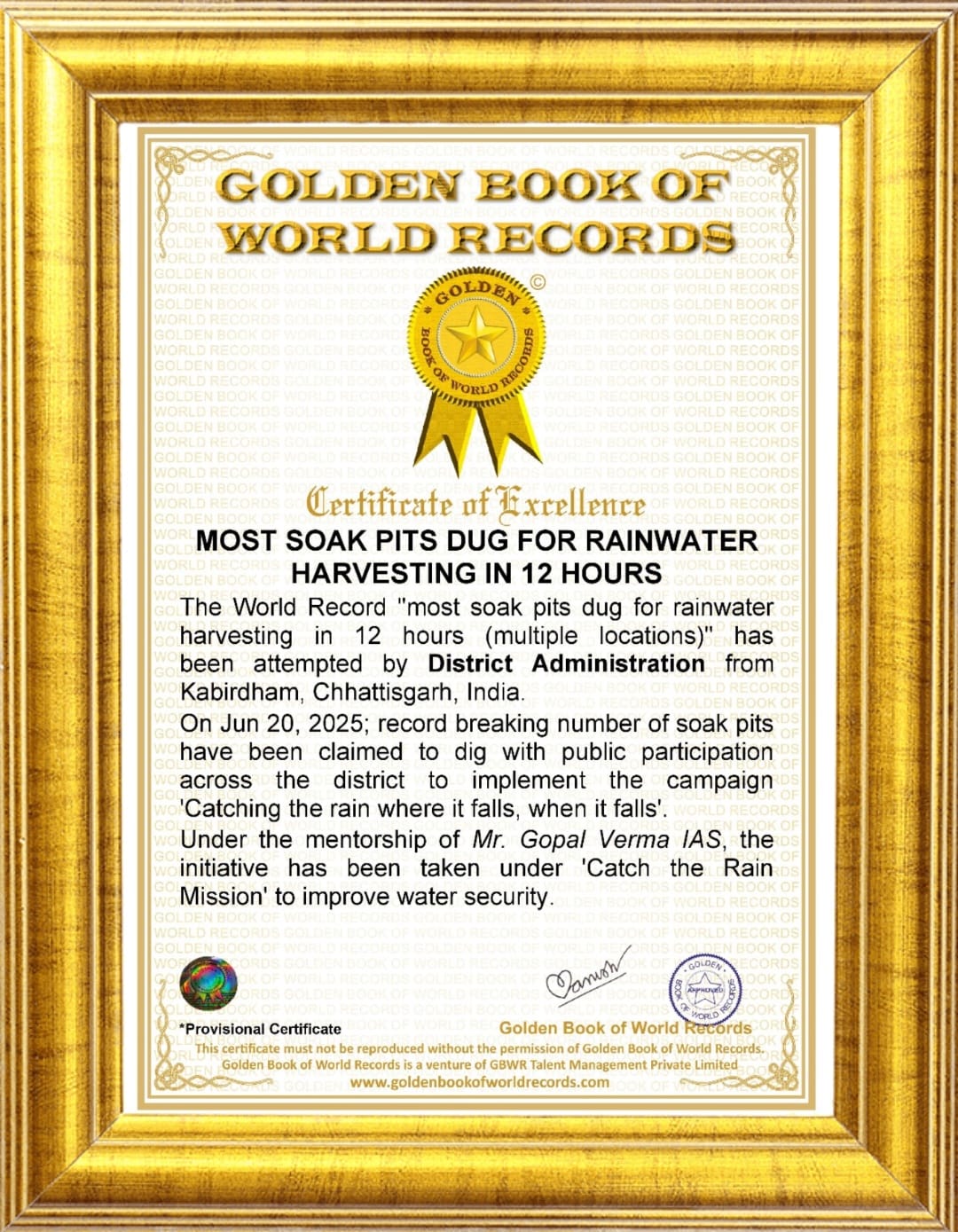 गोल्डन बुक ऑफ वर्ल्ड रिकॉर्ड्स के एशिया प्रमुख ने कलेक्टर श्री गोपाल वर्मा को प्रोविजनल वर्ल्ड रिकॉर्ड प्रमाण पत्र सौंपा